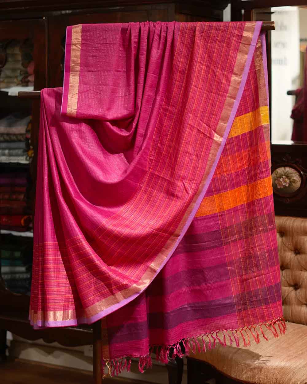 Founded by Deepa Krishnan, Magic Room is based in Mumbai and brings you handcrafted textiles and saris from across India. The brand’s Eris Silk saris are worth your attention thanks to how minimal yet beautifully crafted they are.