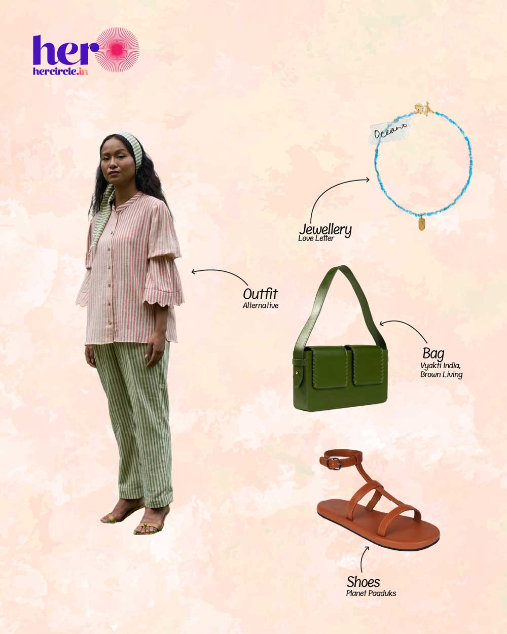 This one’s perfect for a day out! The scarlet top and moss pant set from Alternative makes a case for two-tone drama in soft, breathable cotton. Pair it with ocean-inspired accessories from Love Letter, vegan leather sandals from Planet Paaduks, and a structured cactus leather shoulder bag from Vyakti India.