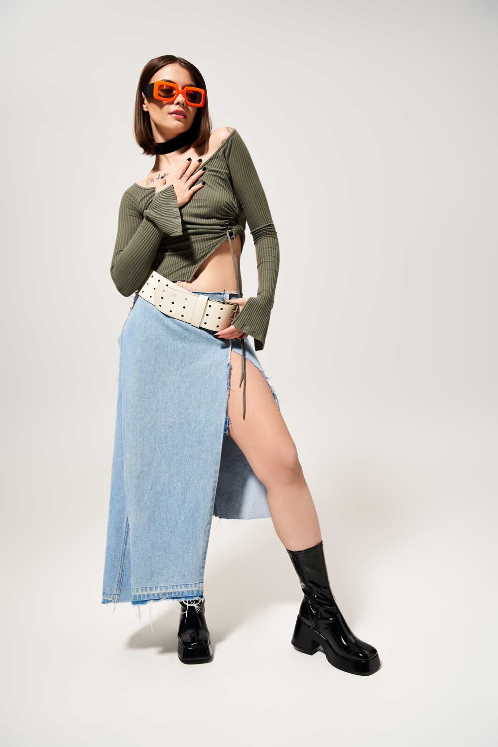 How to wear a jean skirt that’s asymmetric? Don’t worry–the uneven hemline adds a cool twist to your getup, without overpowering your style. Pair it with an off-shoulder top and bring in a playful charm. The combo balances the fashionable edge of the skirt and the elegance of the top, offering you an attire that can win hearts.