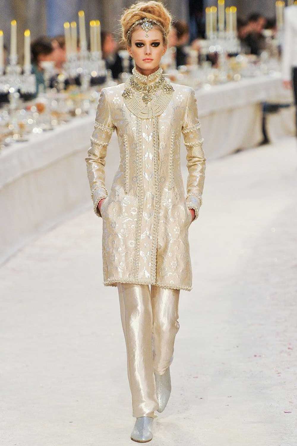 For Fall 2012, Karl Lagerfeld took Chanel on a luxurious detour to India with the Paris-Bombay Métiers d’Art collection. A tribute to the grandeur of Indian royalty, the show featured bandhgala-inspired kurtas, brocade tunics, draped skirts, and lamé leggings, all styled with an unmistakable Chanel twist- tweed jackets adorned with pearls, crystals, and over-the-top jewellery. While rich in aesthetic, the collection walked the line between homage and high-fashion fantasy, spotlighting how India’s regal past continues to influence Western couture.