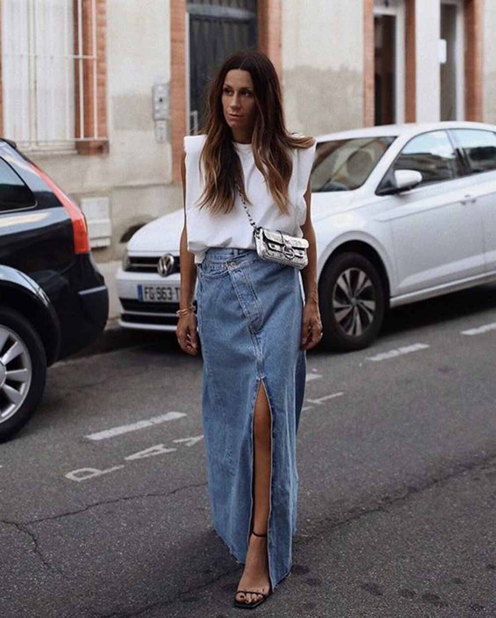 A denim maxi or midi skirt can be a super cool way to upgrade your streetstyle or casual look. Try it with basics to let your skirt do the talking. An easier way to achieve the look is to turn your old jeans into a skirt by simply opening up the inside seams and stitching them together.