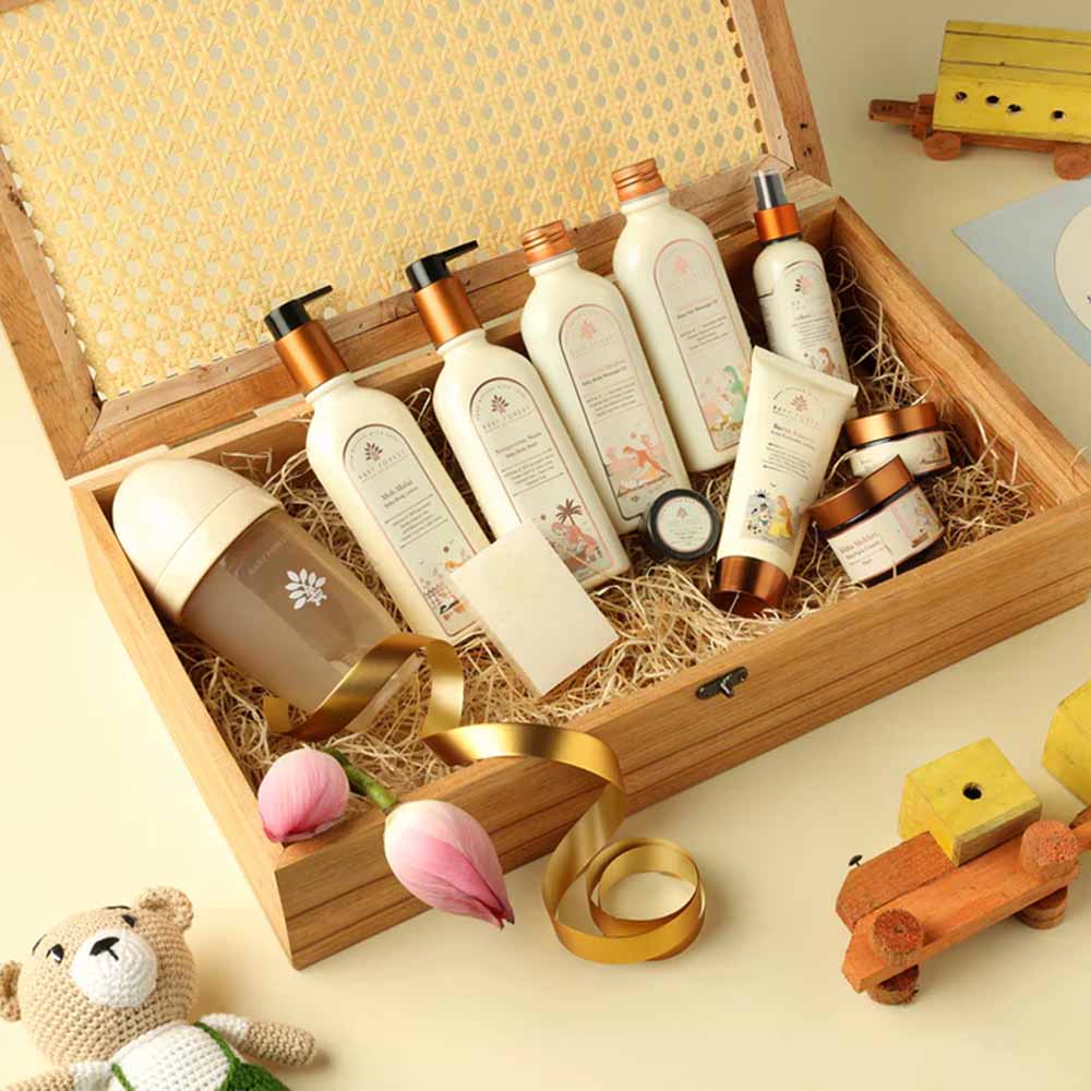 Celebrating a little one this Christmas? Do it with the Nanhi Pitari - Wooden Gifting Box from Baby Forest. Inside the beautifully hand-crafted wooden box, find Ayurvedic care essentials packed with natural ingredients, essential oils, and seed extracts—providing gentle care for the little one. You can personalize the gift further by adding your lovely wishes in a handwritten note. It's a thoughtful and caring gift for new parents, ensuring the journey with their baby begins with tender, natural care.