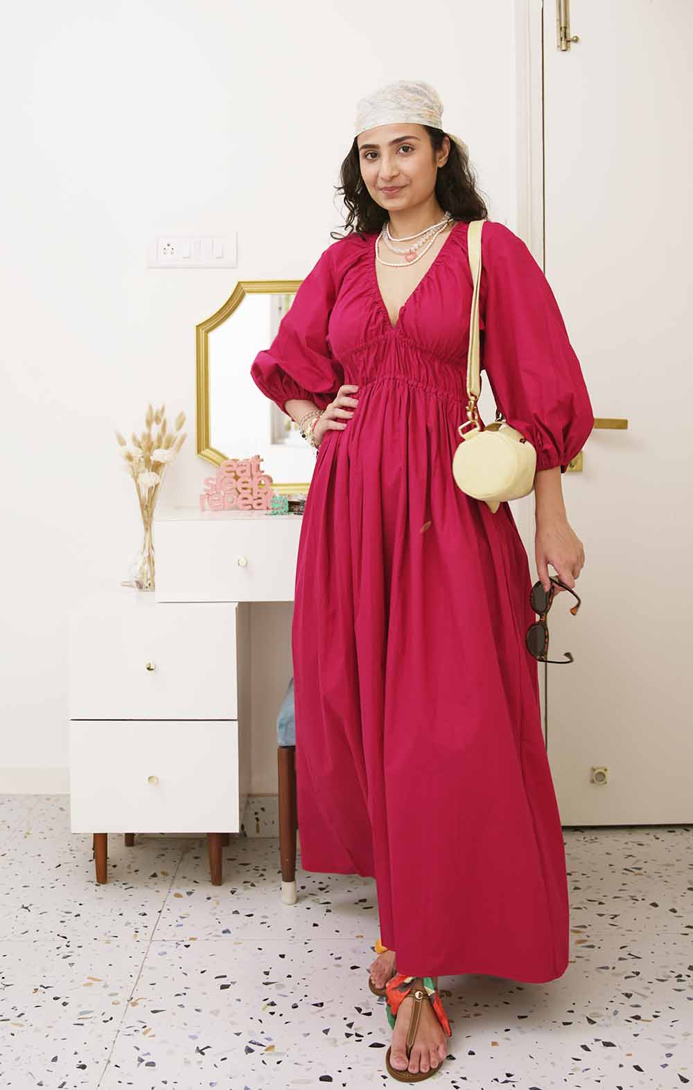 So when I knew I was about to chat with Meghna Goyal, the founder of Summer Away – a brand that doesn’t make me choose between style and sustainability – my curiosity took the form of endless questions. According to Goyal, one principle always took centre stage for her decision-making with Summer Away, longevity. ‘Not every piece needs to chase a trend. We focus on silhouettes, colours, and details that people will want to wear repeatedly. When something has longevity built into it, the sustainability aspect follows naturally,’ she says. While Summer Away has always felt current, it became clear early on in our conversation that its appeal lies in something deeper – timelessness. Take, for instance, this fuchsia dress. I styled this piece from the brand almost two years ago, but would I still wear it today? The answer was a resounding ‘yes’.