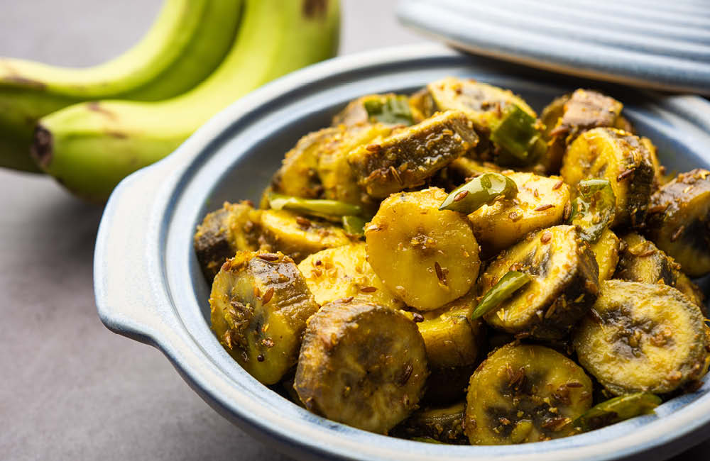 1. Cut raw bananas into half and pressure cook them with 1/4 cup of water for 2 to 3 whistles.