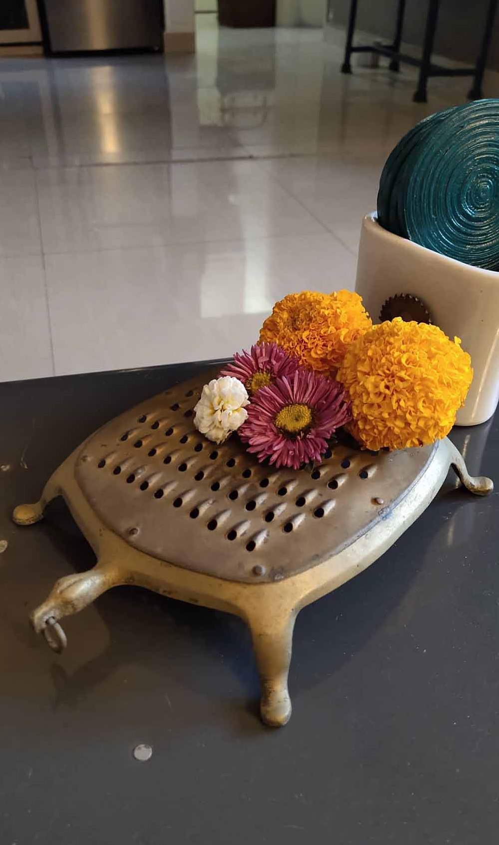 Your most unique brass pieces can become a conversation starter at home. For instance, if you have a vintage style nut breaker, animal-shaped grater, lamp, or idols, then you can use them as paper weights on your centre table. If you have any hollow brass vessel or semi-shallow tray lying at home, you can use it for floating or arranging flowers in it.