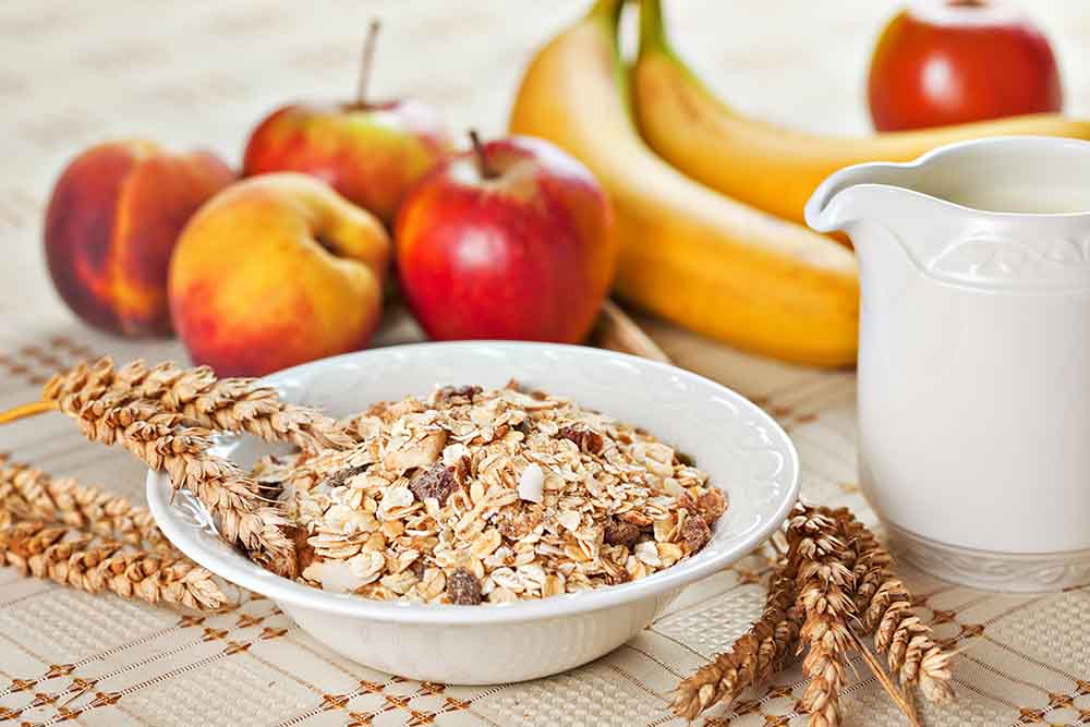 A serving of cooked oatmeal contains 140 calories, 10 grams of protein, 2.5 grams of fat, 28 grams of carbs and 7 grams of fibre. Oats are induced with high-quality protein, antioxidants, vitamins and minerals that lower cholesterol levels in the body and promote healthy skin. With its beta-glucan, the food digests slowly, instilling a feeling of fullness for hours.