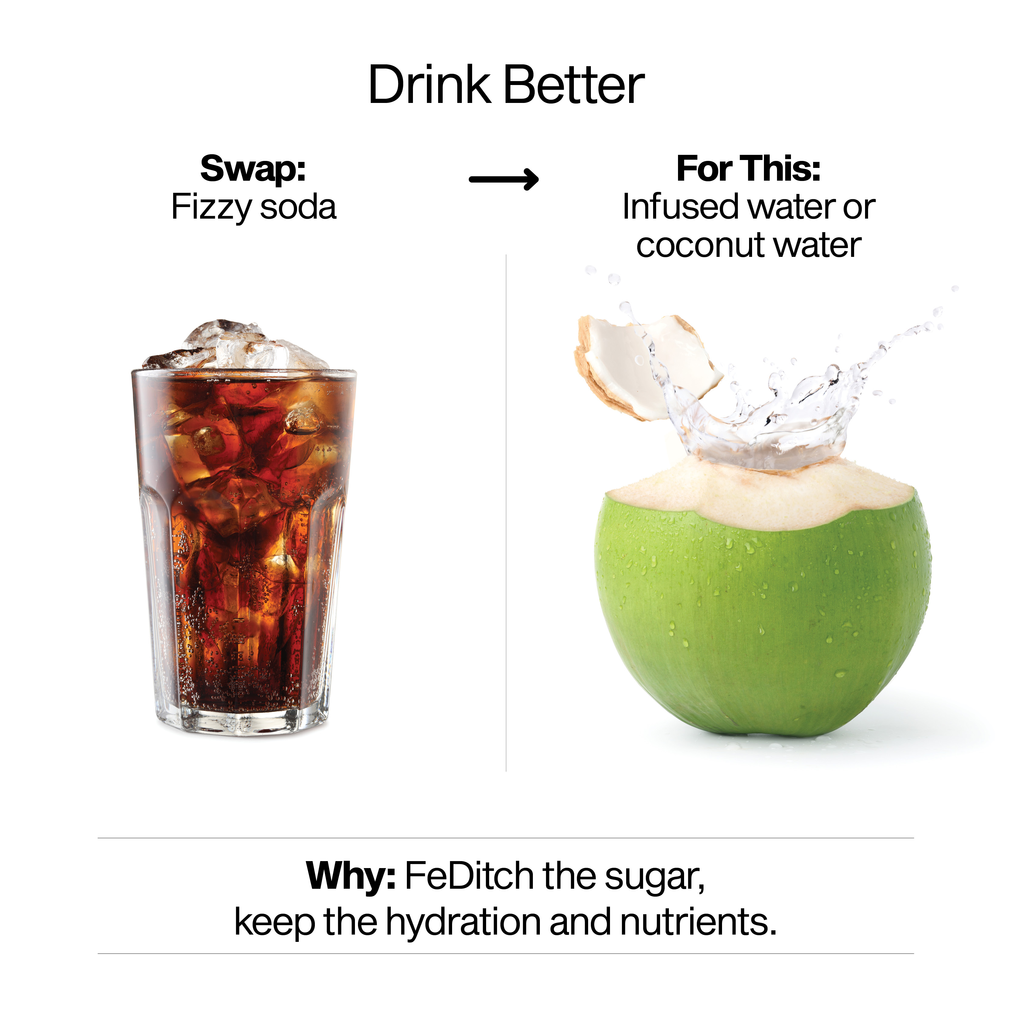Why it works: Fizzy drinks can add a shocking amount of sugar to your day, sometimes more than 10 teaspoons in a single can! Try swapping that cola for infused water (with mint, lemon, or cucumber) or refreshing coconut water. Both options keep you hydrated and mineral-balanced without the empty calories. Your skin, kidneys, and mood will thank you.