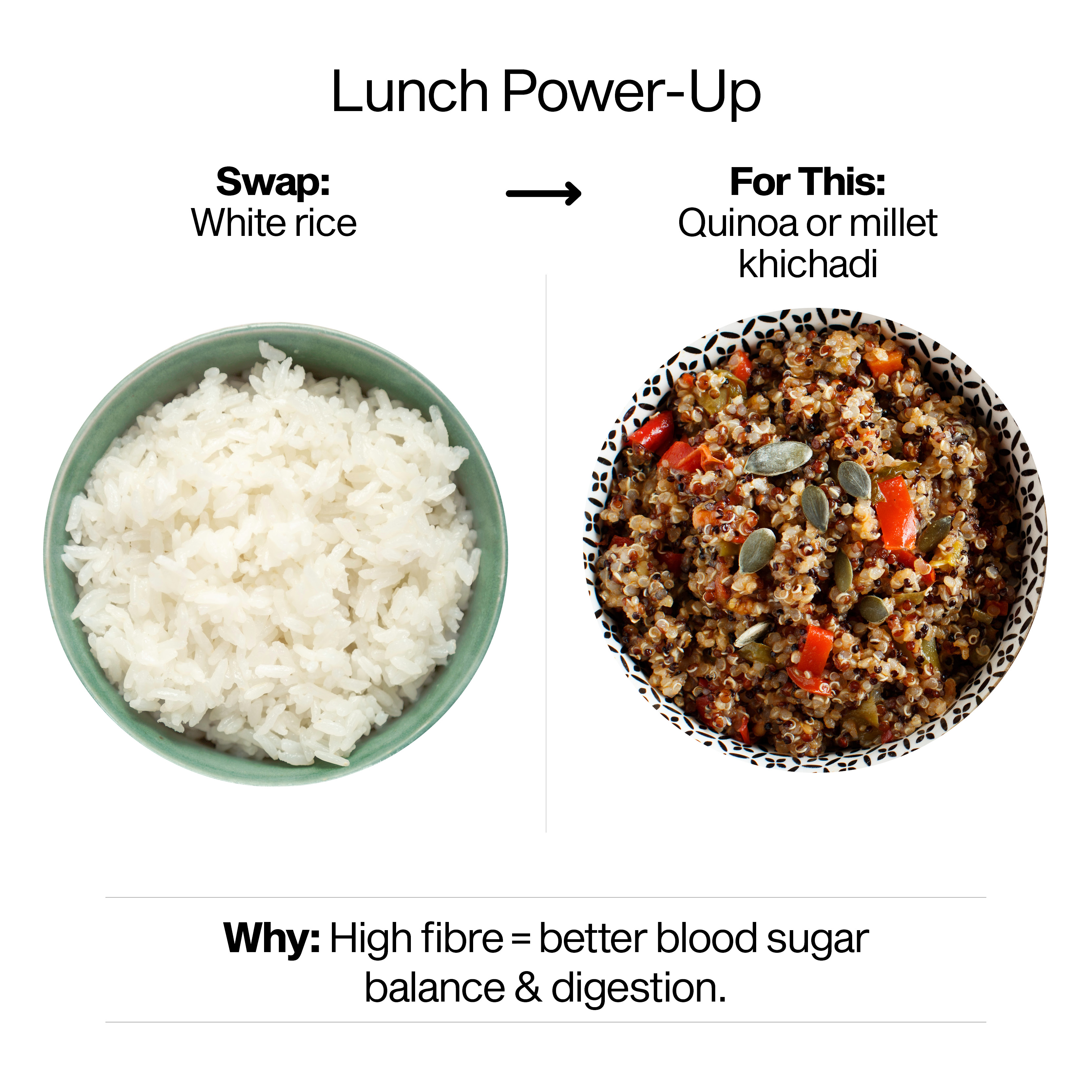 Why it works: White rice is a staple in many Indian households, but it’s low in fibre and nutrients. Quinoa or millets like bajra and jowar, on the other hand, are rich in fibre, protein, and minerals. A millet khichadi is easy to digest, helps stabilise blood sugar, and keeps you fuller for longer and is perfect for busy afternoons when lunch often becomes a rushed affair.