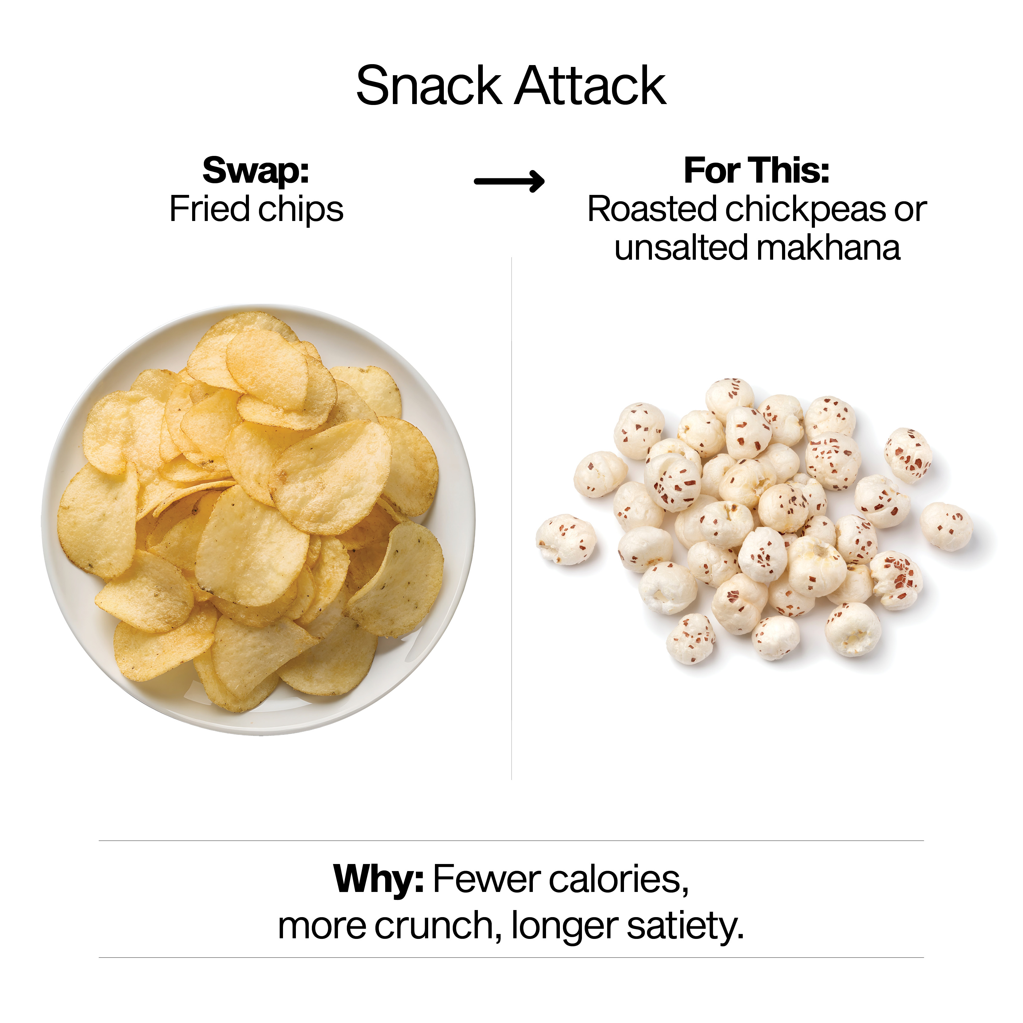 Why it works: When the 4 p.m. hunger pangs hit, it’s easy to grab a packet of chips. But those deep-fried bites are high in saturated fats and low in nutrition. Roasted chickpeas or makhana, on the other hand, are high in protein and fibre, with fewer calories but the same satisfying crunch. You’ll stay full longer and avoid the guilt that often follows mindless snacking.