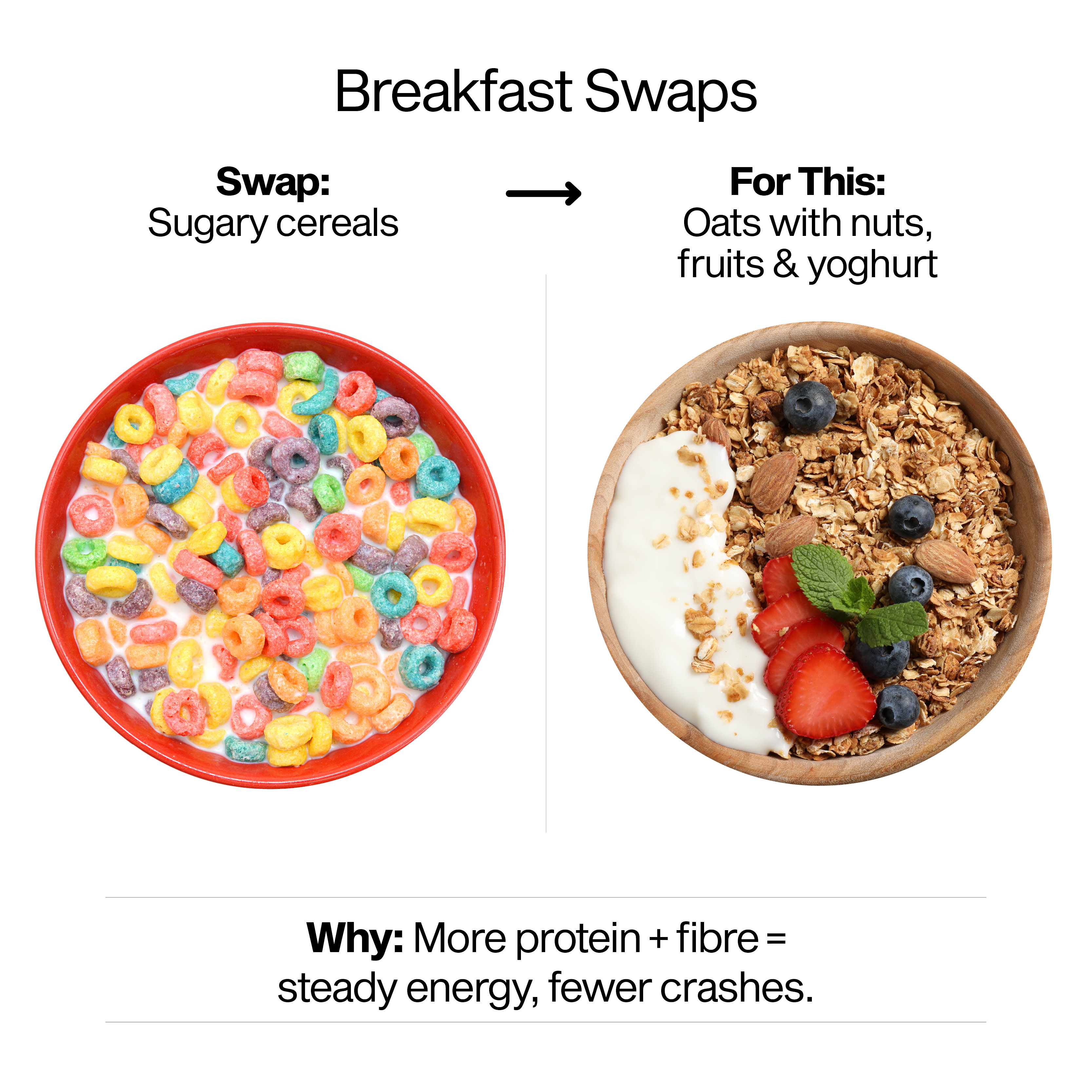 Why it works Those colourful cereals may look tempting, but they’re often packed with sugar and refined carbs that spike your blood sugar and leave you feeling sluggish soon after. Switching to oats topped with fruits, nuts, and a spoonful of yoghurt gives you protein and fibre, helping maintain steady energy levels through the morning. Think of it as fuel for your day, not a quick sugar rush.
