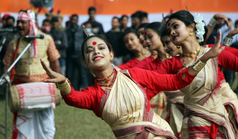 असम में माघ महीने की संक्रांति के पहले दिन से माघ बिहू अर्थात भोगाली बिहू मनाया जाता है। इस दौरान खान-पान धूमधाम से होता है, क्योंकि तिल, चावल, नारियल और गन्ना फसल उस समय भरपूर होती है। इस दिन लोग नाचते गाते हैं और कई तरह के पिठ्ठे बनते हैं।