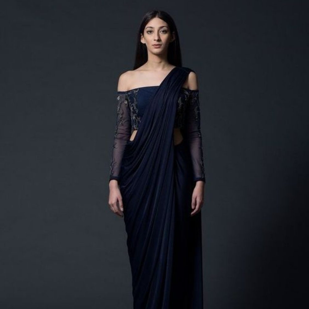 इन दिनों ऑफ शोल्डर टॉप्स को भी जम कर ब्लाउज के रूप में इस्तेमाल किया जा रहा है, इसकी वजह यह है कि इसमें काफी वेरायटी मिल जाती है, साथ ही कलर्स भी ढेर सारे उपलब्ध रहते हैं। इसलिए इन टॉप्स की काफी डिमांड भी बढ़ती जा रही है। इन्हें भी साड़ी की आंचल की प्लेट्स को कमर से थोड़ा सा नीचे लेते हुए, फिर दूसरे कंधे पर पिन अप किया जा सकता है।