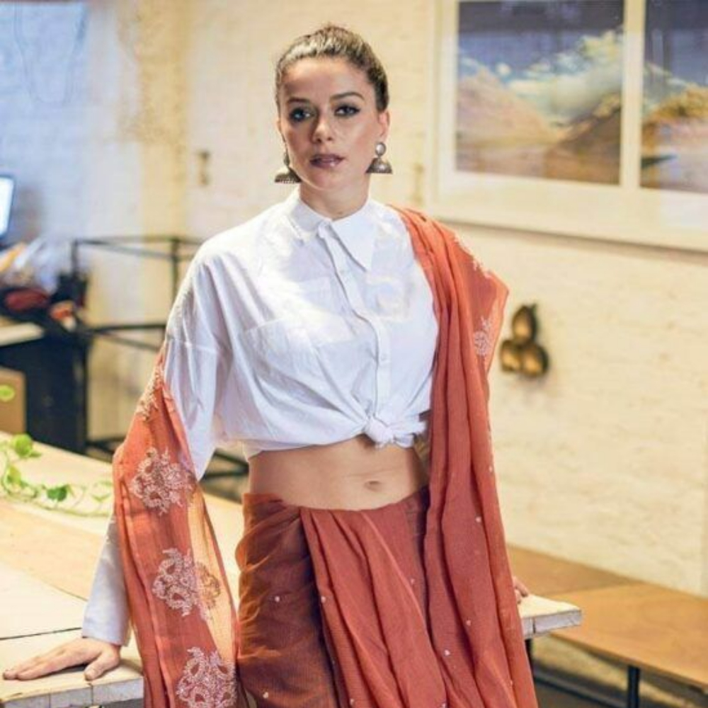 आजकल एक और स्टाइल, जो काफी पसंद किया जा रहा है, वह है हाफ या मिड लेंथ कुर्ती पर स्टाइल की गई साड़ी। कुर्ती को भी आप आराम से ब्लाउज की तरह इस्तेमाल करें और उस पर ज्वेलरी पहन लें, आपको यह एक अलग ही लुक देगा, अगर आपकी कुर्ती ढीली है, तो आपको इस पर बस एक बेल्ट लगाने की जरूरत है। यह एथेनिक लुक के साथ फ्यूजन का फील भी देगा।