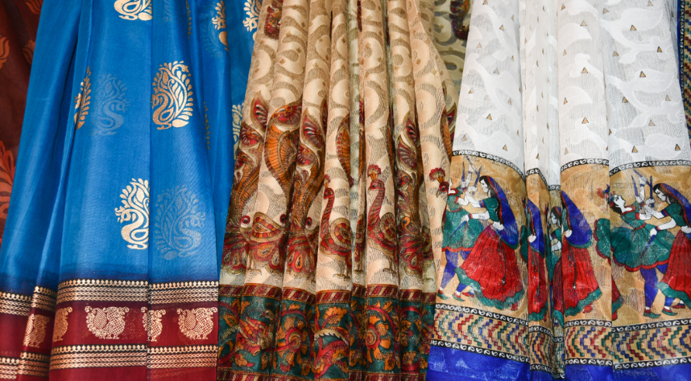पेंटिंग वाली साड़ियां भी काफी पसंद की जाती हैं, दुर्गा मां की बनी हुईं तस्वीरें, मधुबनी पेंटिंग्स और ऐसी कई ट्रेडिशनल साड़ियों को कोलकाता में दुर्गा पूजा के दौरान जरूर पहनना पसंद करती हैं, पेंटिंग वाली साड़ियों में काफी प्यारी नजर आती हैं, इन साड़ियों पर प्लेन ब्लाउज बेहद खूबसूरत नजर आते हैं।