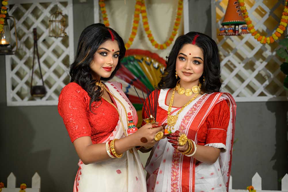 दुर्गा पूजा के दौरान, विशेष रूप से पश्चिम बंगाल में, लाल और सफेड साड़ी, जिसे लाल पार या गरद के नाम से जाना जाता है, पवित्रता और शक्ति का प्रतीक एक प्रतिष्ठित और बेहद लोकप्रिय पारंपरिक परिधान है। सफेद के आधार पर लाल बॉर्डर वाली इस साड़ी को महिलाएं सिंदूर खेला जैसे प्रमुख अनुष्ठानों के लिए पहनती हैं। लाल और सफेद के अलावा, डार्क और गोल्डन रंगों या रेशमी और सूती रंगों में अन्य उत्सव और पारंपरिक साड़ियां भी पहनी जाती हैं, जिनका चयन कभी-कभी पूजा के दिन के अनुसार अलग-अलग होता है। अगर हम इसके प्रतीकात्मक महत्व की बात करें, तो यह लाल रंग शक्ति, प्रेम और ऊर्जा का प्रतिनिधित्व करता है। वहीं सफेद मासूमियत और शांति का प्रतीक है। वहीं संयोजन लाल और सफेद का संयोजन एक संतुलित और शुभ रूप प्रदान करता है, जो भक्ति और उत्सव की भावना को दर्शाता है।
