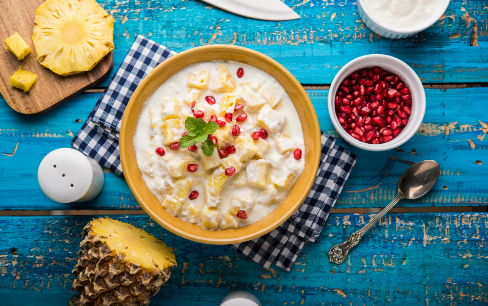 दुर्गा पूजा के दौरान लगभग हर तरह के फ्रूट्स मिल ही जाते हैं, ऐसे में सीजनल फ्रूट्स आप ले लें, जैसे पपीता, सेब, केला, ग्रीन सेब, अनानास और नाशपाती जैसी चीजें और इन्हें बारीक सलाद की तरह काट कर, सबको दही के साथ अच्छी तरह से मिला लें और फिर इसे खाएं। चाहें, तो थोड़ी काली मिर्च का पाउडर डाल कर खाएं, काफी स्वाद आएगा।