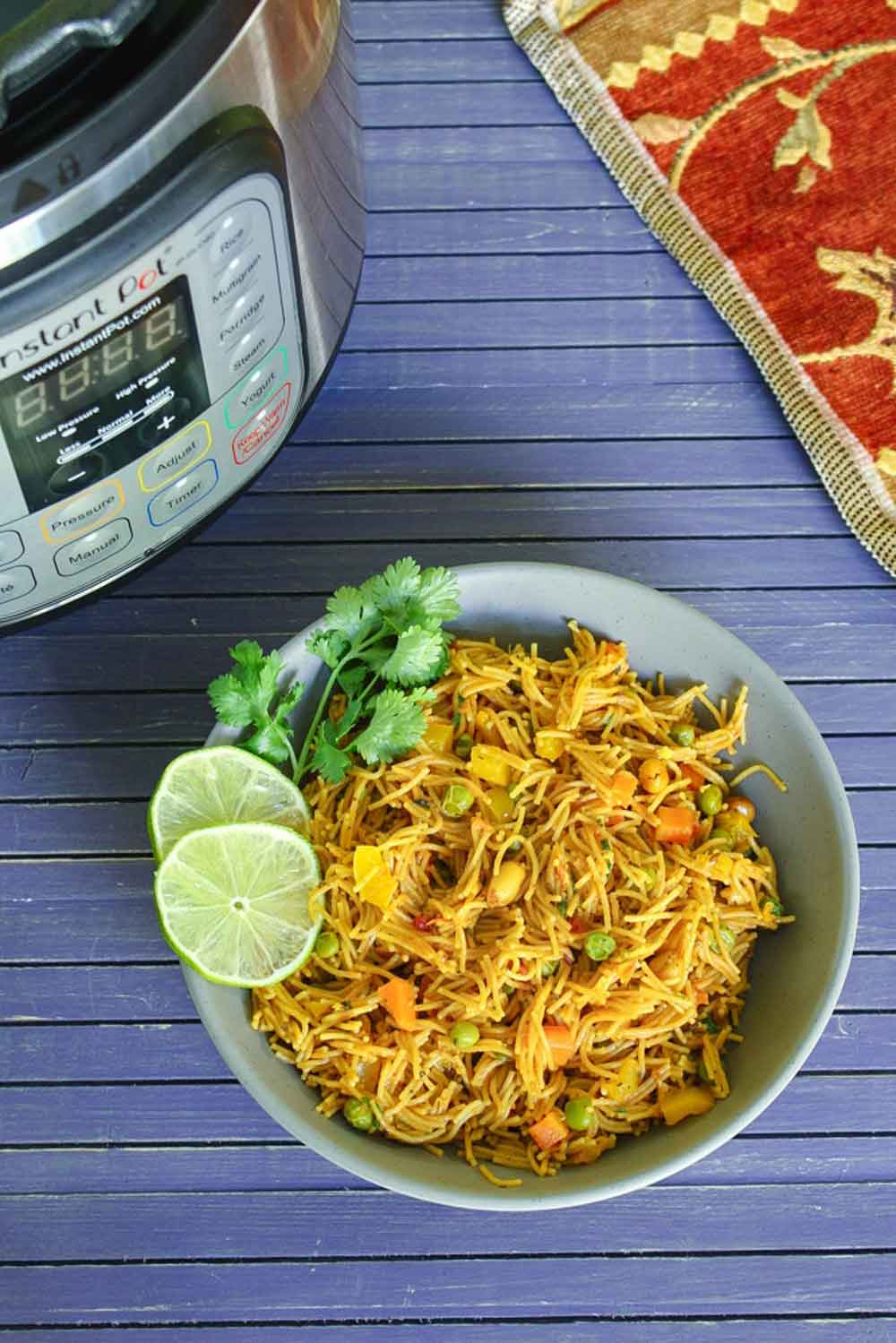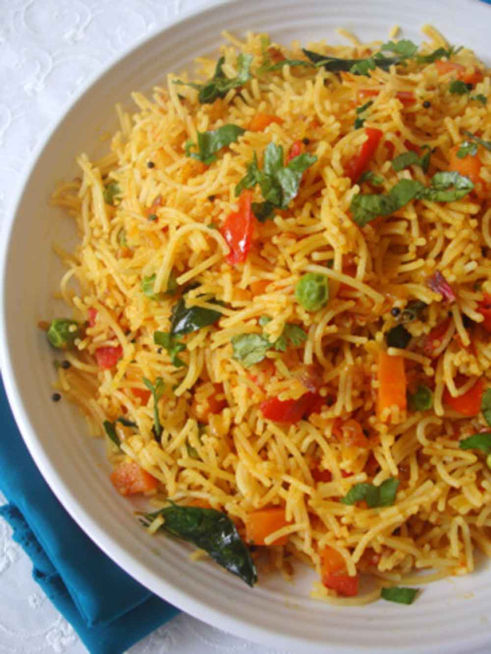 कड़ाही में तेल गरम करें, उसमें राई, जीरा, करी पत्ते और हरी मिर्च डालें। प्याज डालकर भूनें, फिर गाजर और मटर डालकर हल्का पकाएं। हल्दी, लाल मिर्च पाउडर और नमक डालकर मिलाएं। पानी डालें और उबाल आने दें। सेवई डालें और अच्छी तरह मिलाकर धीमी आँच पर पकाएं। जब पानी सूख जाए तो गैस बंद करें और गरमागरम परोसें।