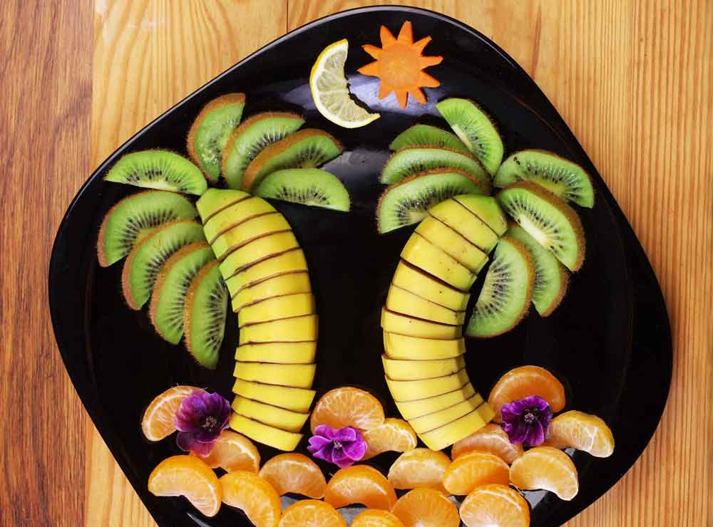 यह बच्चों के साथ मेहमानों के लिए भी काफी आकर्षित होती है। इसमें आपको फल का डिजाइन भालू. खरगोश, कछुआ जैसा दिखने में बनाना है। इसे बनाने के लिए तरबूज, खरबूजा, सेब, केला, अंगूर, कीवी और संतरा लें। इसके अलावा चाकू, स्कूपर, टूथपिक के साथ बड़ी प्लेट या ट्रे लें। इसे बनाने के लिए तरबूज को आधा काट लें और अंदर का एक थोड़ा हिस्सा निकालकर खाली जगह बना लें। तरबूज के ऊपर बीच में थोड़ा हिस्सा छोड़कर दोनों तरफ से काटें और बीच का हिस्सा हैंडल जैसा दिखेगा। तरबूज, तरबूज, कीवी, सेब को छोटे टुकड़ों या बॅाल शेप में काटें। इन्हें टोकरी के अंदर भर दें। ध्यान रखें कि रंग-बिरंगे फल ज्यादा आकर्षक लगते हैं। भालू बनाने के लिए तरबूज का बेस लें, सेब और संतरे के स्लाइस से कान, अंगूर से आंखें, स्टॅाब्रेरी से नाक तैयार करें। बर्ड बनाने के लिए संतरे के टुकड़े से चोंच, अंगूर से आंखें, सेब और कीवी के स्लाइस से पंख तैयार करें। टोकरी के सजावट के लिए पुदीने के पत्ते लें और रंगों का बैलेंस रखें। ध्यान रखें कि टूथपिक को बच्चों से दूर रखें।