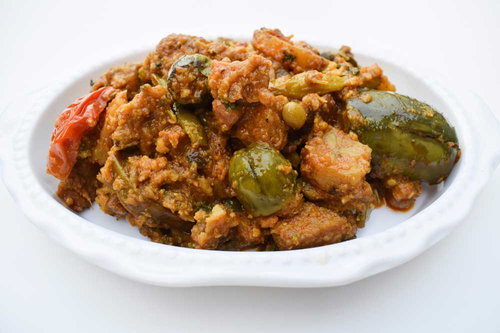 एक कढ़ाई में मध्यम आंच पर 2 बड़े चम्मच मूंगफली का तेल गरम कर लें। अब इसमें 1 छोटा चम्मच सरसों डालकर उन्हें चटकने दें। अब इसमें 1 छोटा चम्मच जीरा डालें और रंग बदलने तक भून लें। आंच को धीमा करके अब इसमें 1 छोटा चम्मच मिर्च पाउडर, 1/4 छोटा चम्मच हल्दी पाउडर, कुछ करी पत्ते और 2 चुटकी हिंग डालें और आंच को मध्यम कर दें। अब इसमें भिगोई और छानी हुई मूंगफली, 1/4 कप हरा चना, 1/4 कप कटी हुई गाजर और ड्रमस्टिक डालें। 2 से 3 मिनट तक भूनें। इसके बाद, 1/4 कप आलू के टुकड़े डालें और अच्छी तरह मिलाएं। 1/3 कप पानी डालें और ढककर तब तक पकाएँ जब तक सब्ज़ियां थोड़ी नरम न हो जाएँ। इसके बाद, 1/4 कप पावटा बीन्स और 1/4 कप बैंगन के टुकड़े डालें। इन सबको तब तक अच्छी तरह पकाएं, जब तक कि सारी सब्जियां पक न जाएं। अब इसमें आधा चम्मच गोडा मसाला, नमक और 1/4 कप पानी डालकर अच्छी तरह मिलाएं और ढककर 2 से 3 मिनट तक पकाएं। 3 मिनट बाद इसमें 1 छोटा चम्मच इमली का गूदा डालें और अच्छी तरह मिला लें और आंच बंद कर दें। अब इसमें कसा हुआ गुड़, मूंगफली पाउडर और तिल पाउडर डालकर अच्छी तरह मिला लें। अंत में, कसा हुआ नारियल डालें और हल्के हाथ से मिलाएं और ताजा कटे हरे धनिये से गार्निश करके तिल लगी बाजरे की भाकरी और मक्खन के साथ परोसें।