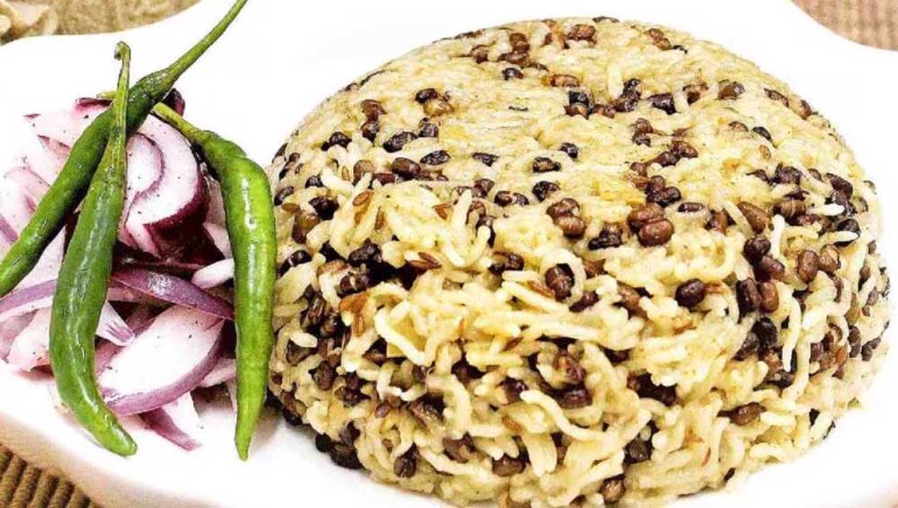उड़द दाल की खिचड़ी बनाने के लिए कुकर में 2 से 3 बड़ी चम्मच घी डाल कर गर्म कर लीजिए। घी गर्म हो जाने पर इसमें 1/2 छोटी चम्मच जीरा, 1/2 चुटकी हींग, 1 इंच दाल चीनी, 2 लौंग, 5-6 काली मिर्च और 1/2 बड़ी इलायची डाल कर मध्यम आंच पर भून लीजिए। जब मसाला हल्का सा भुन जाए तो इसमें 1 टमाटर, 1/4 छोटी चम्मच हल्दी पाउडर, 2 हरी मिर्च, 1/2 इंच अदरक और 1/2 कप हरी मटर डाल कर हल्का सा चलाते हुए भून लीजिए। टमाटर जब हल्का सा गल जाए तो इसमें 1/4 कप उड़द दाल और 1/2 कप चावल के साथ 1/4 छोटी चम्मच लाल मिर्च पाउडर और 3/4 छोटी चम्मच नमक डाल कर सभी चीजों को मिलाते हुए 1-2 मिनट तक भून लीजिए। 2 मिनट बाद कुकर में 1.5 कप पानी डाल कर कुकर का ढ़क्कन लगा कर कुकर में एक सीटी आने तक तेज आंच पर पका लीजिए। कुकर में सीटी आने पर आंच को बंद कर दीजिए और कुकर का प्रेशर खत्म होने तक इसे यूं ही रहने दीजिए। जब कुकर का प्रेशर खत्म हो जाए तो खिचड़ी प्लेट में निकाल कर सर्व कर लीजिए। मकर संक्रान्ति के दिन उड़द दाल की खिचड़ी बनान बहुत ही शुभ माना जाता है।