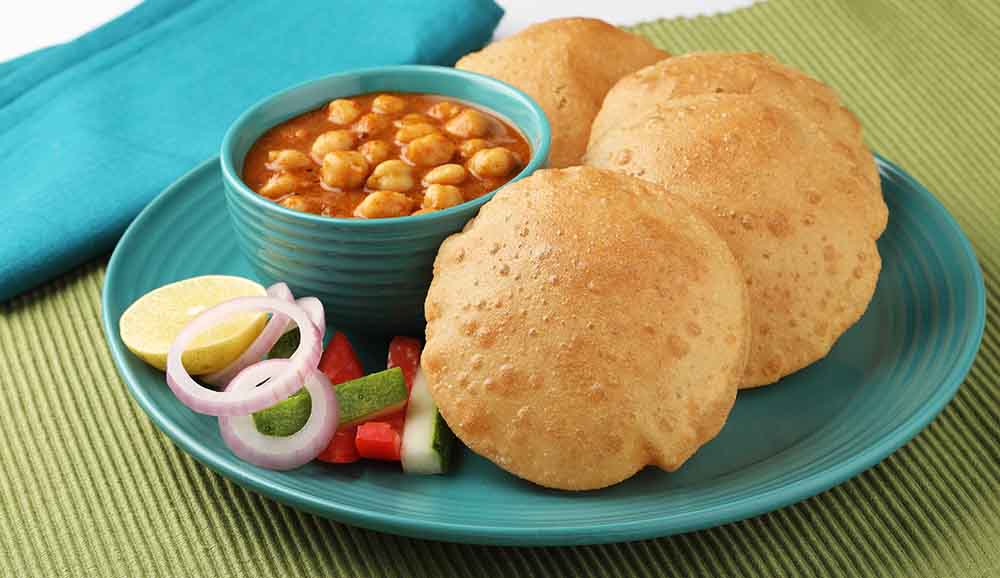 भटूरे बनाने के लिए एक बाउल में मैदा, दही, चीनी, बेकिंग सोडा और नमक डालकर अच्छी तरह मिला लें और फिर थोड़ा-थोड़ा पानी डालकर नरम आटा गूंथ लें। आटे को 2-3 घंटे के लिए ढककर रख दें। 3 घंटे बाद जब आटा फूल जाए, तो उसकी छोटी-छोटी लोइयाँ बना लें। लोई को बेलन से बेलकर गोल रोटियां बना लें। ध्यान रहे रोटी के मुकाबले भटूरा 1/4 इंच मोटा होना चाहिए। एक कढ़ाई में तेल गरम करें। फिर भटूरों को गर्म तेल में डालकर दोनों ओर से सुनहरा और कुरकुरा होने तक तलें। अब गरमागरम छोलों को प्याज, नींबू और हरे धनिये की चटनी के साथ सजाते हुए भटूरों के साथ परोसें और आप भी छोले-भटूरों का आनंद लें!