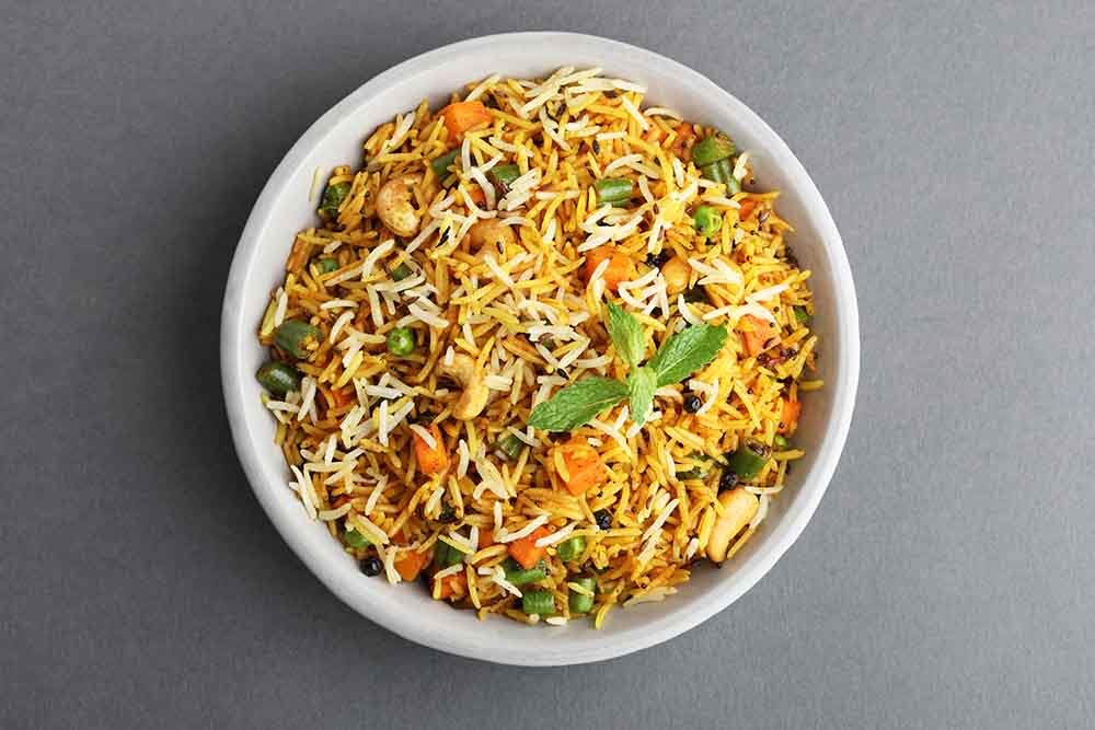 बिरयानी की सब्जी बनाने लिए एक कढ़ाई में तेल या घी गरम कर लें और उसमें कटी हुई प्याज डालकर उसे सुनहरा होने तक भूनें। उसके बाद अदरक, लहसुन और हरी मिर्च डालकर कुछ सेकंड के लिए भूनें। जब ये सब भुन जाए तो उसमें कटी हुई सब्जियां (गाजर, आलू, फूलगोभी, हरी मटर) डालकर अच्छे से मिला लें। लगभग 2 मिनट सब्जियों को भुनने के बाद उसमें दही, बिरयानी मसाला, नमक, हरा धनिया और पुदीना डालकर अच्छी तरह मिला लें और इन्हें 5-7 मिनट तक ढककर पकने दें। जब सब्जियां बनकर तैयार हो जाएं तो बिरयानी में दम लगाने के लिए एक बड़े बर्तन में सब्जियों की एक परत बिछाएं और उसके ऊपर आधे पके चावल डालें। बारी-बारी से सब्जी और चावल की परत बिछाते हुए इस प्रक्रिया को दो से तीन बार दोहराएं और ऊपर से थोड़ा सा घी या तेल डालकर इन्हें 15-20 मिनट तक धीमी आंच पर ढककर पकने दें। यह चावल को भाप में पकने का समय देगा। 20 मिनट बाद आपकी वेजिटेबल बिरयानी बनकर तैयार है। आप उसे रायता या सलाद के साथ गरमागरम परोसें। हालांकि वेजिटेबल बिरयानी बनाने के लिए जरूरी नहीं कि आप वही सब्जियां लें, जो यहां दी गई हैं. आप अपनी पसंद की सब्जियां भी डाल सकती हैं। इसके अलावा इसे और स्वादिष्ट बनाने के लिए आप इसे तले हुए प्याज और उबले आलुओं से भी सजा सकती हैं।